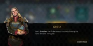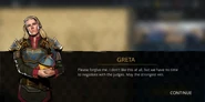 After the players defeats Ambassador's men, Greta arrives and enquires about the commotion as she is already tired of her brother's antics. She asks if the Ambassador had violated the codex which the scout sarcastically confirms by saying she already knew the answer to his question. She is enraged and decides to inform the authorities about this.